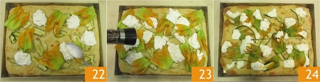 Une fois cuite, sortez la focaccia du four et garnissez-la avec les fleurs de courgette, puis répartissez les morceaux de burrata sur la surface 22. Enfournez à nouveau pour 2-3 minutes, puis poivrez 23 et laissez tiédir avant de déguster votre focaccia de pommes de terre avec burrata et fleurs de courgette 24 !