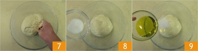 Pétrissez les ingrédients à la main jusqu'à obtenir un mélange homogène 7. Laissez reposer la pâte à température ambiante pendant 5 minutes, sans couvrir le bol, puis ajoutez le sel 8 et l'huile 9.