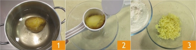 Pour réaliser la focaccia de pommes de terre haute et moelleuse, commencez par faire cuire la pomme de terre dans de l'eau froide jusqu'à ce qu'elle soit suffisamment tendre pour être transpercée avec une fourchette 1. Égouttez la pomme de terre et laissez-la tiédir, puis écrasez-la dans un grand bol 2 et ajoutez la farine 3.