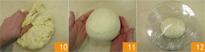 Travaillez la pâte sur le plan de travail pendant environ 10 minutes 10. Si elle est très molle et collante, laissez-la reposer pendant 5 minutes en la couvrant avec le bol. Faites quelques plis à la pâte et formez une boule lisse et homogène 11, puis transférez-la dans le bol huilé, couvrez de film plastique et laissez lever à température ambiante environ 3 heures ou jusqu'à ce que le volume double 12.