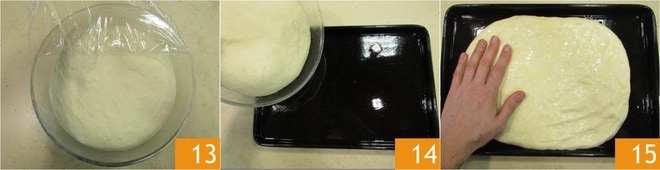 Après le temps de levée 13, faites glisser la pâte dans un moule de 40x27 cm que vous aurez légèrement huilé, en prenant soin de ne pas la retourner 14. Étalez la pâte avec les mains directement dans le moule 15.