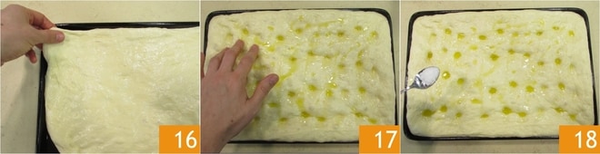 Si la pâte a tendance à se rétracter, laissez-la reposer une minute et étalez-la délicatement pour qu'elle recouvre toute la surface 16. Couvrez le moule avec un autre moule ou un torchon humide et laissez lever une autre heure. Après ce temps, assaisonnez avec de l'huile et pressez les doigts dans la pâte pour créer les trous typiques 17. Ajoutez également les flocons de sel 18.