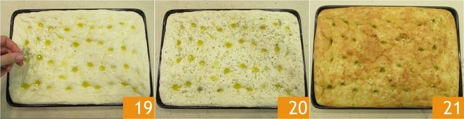 Enfin, saupoudrez d'origan 19 et faites cuire dans un four statique préchauffé à 220° pendant 30 minutes sur la grille inférieure 20. Lorsqu'elle est bien dorée, sortez votre focaccia de pommes de terre haute et moelleuse du four et servez-la encore chaude 21 !