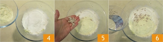Ajoutez également la semoule 4 et la levure fraîche émiettée 5, puis versez la moitié de l'eau 6 et commencez à mélanger avec une cuillère en bois.