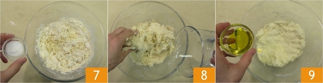 Après avoir amalgamé le mélange, ajoutez le sel 7 et le reste de l'eau en filet 8 tout en continuant à pétrir à la main. Lorsque l'eau est complètement absorbée, ajoutez l'huile 9.