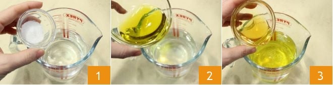 Pour réaliser la fougasse sucrée aux abricots, mettez l'eau dans un pichet, ajoutez le sel 1, le miel 2 et l'huile d'olive extra vierge 3.