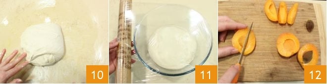 donnez une forme sphérique à la pâte 10 puis placez-la dans un bol couvert de film plastique 11 et laissez lever pendant environ 2 heures dans le four éteint avec la lumière allumée. Pendant ce temps, lavez les fruits, coupez les abricots en tranches de 1,5 cm d'épaisseur en retirant le noyau 12.