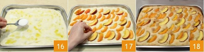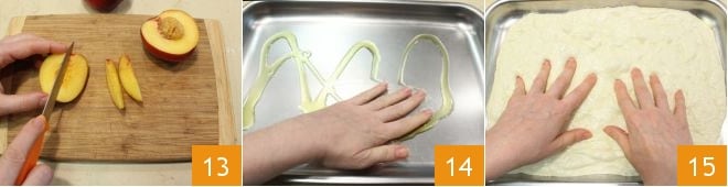 faites de même avec les pêches 13. Huilez avec de l'huile un plateau de dimensions 40 x 30 cm 14 lorsque la pâte aura levé, étalez-la dans le plateau en la pressant légèrement avec les mains. Formez des trous avec les doigts sur la surface de la pâte 15.