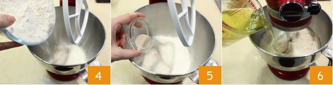 Dans le bol d'un robot équipé d'une feuille, tamisez la farine (vous pouvez utiliser de la farine Manitoba ou de la farine T45) 4 et ajoutez la levure de boulanger déshydratée 5. Mettez la machine en marche et ajoutez les liquides 6.