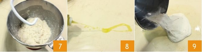 Lorsque les ingrédients sont bien mélangés, retirez la feuille et installez le crochet 7, puis laissez pétrir pendant environ 10-15 minutes. Retirez la pâte du bol du robot, elle aura une consistance assez molle, huilez le plan de travail 8, transférez la pâte sur la table 9.