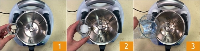 Pour préparer la focaccia tomates cerises et olives avec Bimby, mettez dans le bol la levure de bière 1, le sucre 2 et 100 g d'eau 3. Faites dissoudre la levure pendant 2 minutes à 37°, en réglant la vitesse sur 2.