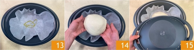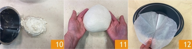 Transférez la pâte sur le plan de travail fariné 10 et formez une boule lisse et homogène 11. Entre-temps, tapissez le récipient du Varoma avec une feuille de papier sulfurisé 12.