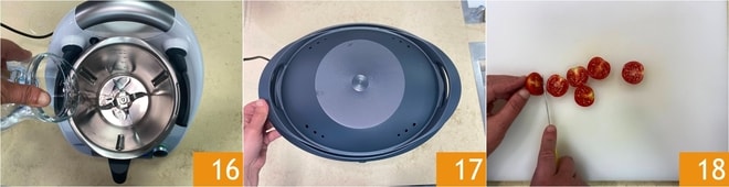 Placez dans le bol 250 g d'eau 16 et le jus de citron, fermez avec le couvercle et positionnez le Varoma dessus 17. Réglez le programme de fermentation pour 2 heures à 37°. Maintenant, lavez les tomates cerises et coupez-les en deux, en les mettant de côté 18.