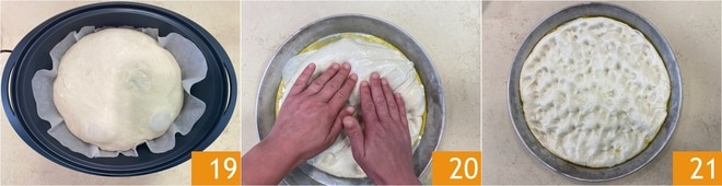 Une fois la levée terminée, retirez délicatement le Varoma 19. Versez la pâte dans un moule huilé de 32 cm de diamètre et étalez-la avec les mains 20. Avec les bouts des doigts, pressez la pâte pour créer des trous 21.