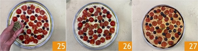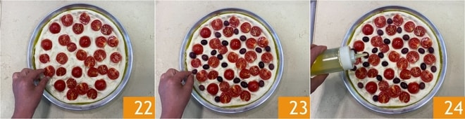 Disposez les tomates cerises en appuyant légèrement 22, puis faites de même avec les olives 23. Salez la surface et assaisonnez d'un généreux filet d'huile 24.