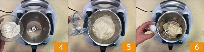 Ajoutez 50 g de farine T55 4 et mélangez pendant une minute à vitesse 3. Laissez reposer dans le bol pendant 10 minutes. Incorporez le reste des farines et versez également les 200 g d'eau restants 5, puis pétrissez avec la fonction épi pendant 2 minutes. À ce stade, ajoutez les 10 g de sel 6.