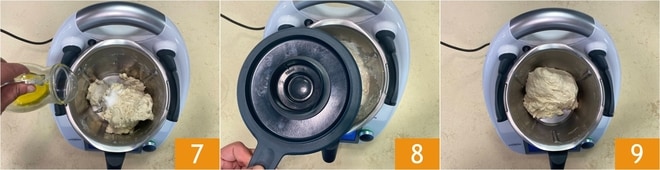 Versez les 35 g d'huile d'olive extra-vierge 7 et pétrissez à nouveau avec la fonction épi pendant 2 minutes 8 9.