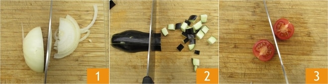 Pour réaliser la focaccia sans gluten avec caponata, commencez par les ingrédients de la caponata rapide : nettoyez l'oignon et coupez-le en julienne 1, puis équeutez les aubergines et coupez-les en cubes de 2 cm 2. Enfin, divisez les tomates cerises en deux 3.