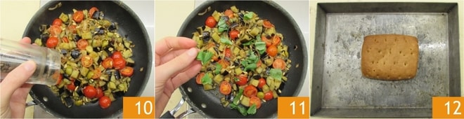 Salez, poivrez 10 et faites cuire encore 10 minutes, puis parfumez avec quelques feuilles de basilic déchirées à la main 11. À ce stade, déposez les focaccias sur une plaque et enfournez-les à 200° en mode grill pendant 5 minutes 12.