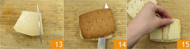 Entre-temps, coupez le pecorino en tranches d'environ un demi-centimètre d'épaisseur 13. Vous êtes prêts à assembler les ingrédients : divisez la focaccia en deux horizontalement 14 et déposez les tranches de pecorino 15.