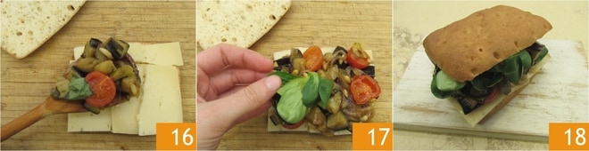 Ajoutez 2 cuillères à soupe de caponata 16 et complétez avec la mâche 17. Refermez la focaccia et procédez de la même manière avec la seconde. Votre focaccia sans gluten avec caponata est prête à être dégustée 18 !