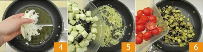 Mettez l'oignon dans une poêle antiadhésive avec un filet d'huile 4 et faites-le dorer à feu doux pendant environ 10 minutes. Ajoutez les aubergines 5, augmentez le feu et faites-les revenir pendant 10 minutes supplémentaires, puis ajoutez les tomates cerises 6.
