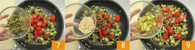 Assaisonnez avec les câpres dessalées 7, les pignons de pin 8 et les olives coupées grossièrement 9.