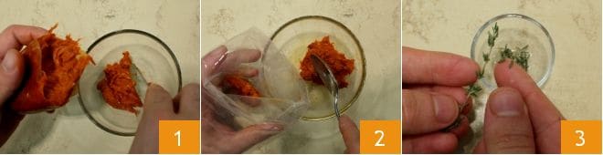 Pour préparer les schiacciate avec nduja et olives noires au four, procurez-vous le salami nduja: mettez-le dans un petit bol 1 puis versez-le dans la poche à douille en vous aidant avec une cuillère 2. Prenez quelques brins de thym et détachez les petites feuilles 3 qui serviront à garnir les schiacciate. Enfin, procurez-vous des olives noires séchées au four, que vous pouvez également assaisonner dans un petit bol avec du poivre rose broyé, de l'origan et un filet d'huile d'olive extra vierge pour les relever davantage.