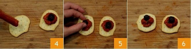 Maintenant, vous pouvez composer vos schiacciate avec nduja et olives noires au four : sur une planche à découper, posez les schiacciate, mettez une noix de nduja avec la poche à douille 4 puis déposez sur chaque schiacciata une olive noire au four 6. Garnissez avec une petite feuille de thym et vos schiacciate avec nduja et olives noires au four seront prêtes à être servies comme finger food piquant!