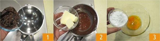 Pour réaliser le fondant au chocolat, commencez par hacher grossièrement le chocolat avec un couteau, puis mettez-le dans un récipient pour une cuisson au bain-marie, c'est-à-dire placez le récipient au-dessus d'une casserole remplie d'eau posée sur le feu 1. Remuez constamment avec une spatule pour le faire fondre complètement, puis ajoutez le beurre 2. Continuez à mélanger pour bien amalgamer le mélange. Une fois prêt, éteignez le feu et mettez de côté. Dans un bol, versez les œufs et le jaune, puis ajoutez le sucre glace 3 et les graines de la gousse de vanille.