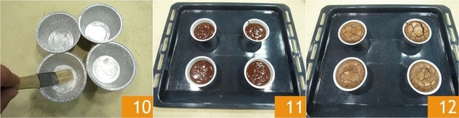 La pâte est prête : prenez 6 moules en aluminium de 7 cm de diamètre supérieur et 4 cm de hauteur, beurrez le fond et le bord, puis saupoudrez l'intérieur avec du sucre roux. Versez la pâte en remplissant les moules aux deux tiers 11, puis cuisez dans un four statique préchauffé à 180° pendant 9-10 minutes (le temps de cuisson dépend de la taille des moules, vous trouverez d'autres indications dans le conseil à la fin de la recette). Une fois la cuisson terminée, sortez immédiatement vos fondants 12.