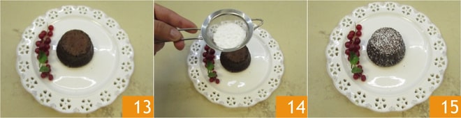 Retournez les fondants encore chauds sur une assiette de service en faisant attention à ne pas vous brûler 13. Complétez en saupoudrant le fondant au chocolat avec du sucre glace 14 et servez immédiatement 15 !