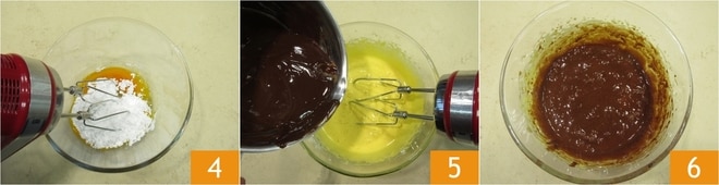 Travaillez le mélange avec des fouets électriques 4 jusqu'à ce qu'il soit clair et mousseux. À ce stade, versez le chocolat fondu à l'intérieur 5 et continuez à mélanger avec les fouets pour amalgamer complètement le mélange 6.