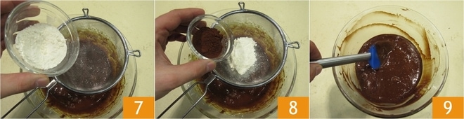 À ce stade, incorporez les ingrédients secs au mélange d'œufs : tamisez dans le bol la farine 7 et le cacao amer 8, puis mélangez avec une spatule pour incorporer les ingrédients 9.