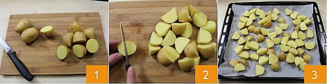 Pour préparer la fondue de Reblochon, commencez par couper les pommes de terre nouvelles avec leur peau en quatre morceaux (1-2) pour obtenir des quartiers. Recouvrez une plaque de cuisson de papier sulfurisé, disposez les quartiers de pommes de terre sur la plaque 3,