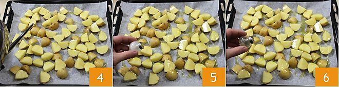 assaisonnez les pommes de terre avec l'huile d'olive versée en filet 4, le sel 5, le poivre noir 6