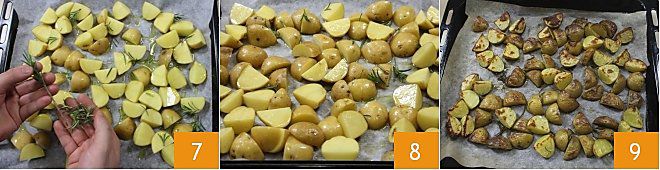 et enfin parfumez les quartiers avec le romarin frais 7. Maintenant, les pommes de terre ainsi assaisonnées 8 sont prêtes à être cuites au four pendant 15 minutes à 200°C dans un four préchauffé en mode statique. Faites cuire les pommes de terre jusqu'à ce qu'elles soient dorées et aient formé une légère croûte en surface 9.