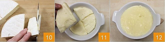 Préparez maintenant la fondue de Reblochon : coupez le fromage en 4 grosses tranches, retirez la croûte externe de chaque tranche 10, placez les tranches dans un plat rond (en céramique ou en terre cuite) pouvant contenir la meule de Reblochon qui mesure environ 13-14 cm de diamètre et 3,5 cm d'épaisseur 11. Enfournez le plat dans un four préchauffé à 200°C pendant environ 25/30 minutes, la fondue sera prête lorsque le fromage sera complètement fondu 12. Servez la fondue de Reblochon chaude avec les pommes de terre au four et, si vous le souhaitez, vous pouvez accompagner le plat d'un plateau de charcuterie.