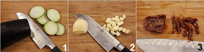 Pour préparer les fougasses aux aubergines, scamorza et tomates séchées, commencez par laver l'aubergine et la couper en tranches rondes assez fines 1. Coupez la scamorza en petits dés 2 et terminez en coupant les tomates séchées en lanières 3.