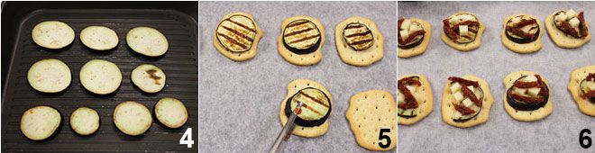 Maintenant, chauffez une poêle en fonte et grillez les aubergines des deux côtés 4; en attendant, placez les 12 fougasses sur une plaque recouverte d'une feuille de papier cuisson. Une fois prêtes, salez légèrement les aubergines et déposez une tranche sur chaque fougasse (si la tranche est trop grande, coupez-la en deux) 5. Garnissez chaque fougasse avec 3-4 dés de scamorza et quelques lanières de tomate séchée 6 et mettez-les au four à 180° pendant environ 5 minutes, jusqu'à ce que la scamorza soit fondue. Complétez les amuse-bouches en ajoutant une feuille de basilic sur chaque fougasse avec aubergines, scamorza et tomates séchées !