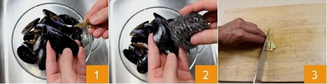 Pour préparer les fougasses avec moules, poutargue et zeste de citron, commencez par nettoyer les moules : vous pouvez également consulter l'École de cuisine Comment nettoyer les moules. Lavez-les soigneusement sous l'eau courante, éliminez le byssus 1, c'est-à-dire la petite barbe qui dépasse de la coquille, et frottez cette dernière avec un tampon à récurer 2 ou grattez avec la lame d'un petit couteau. Hachez finement la gousse d'ail épluchée 3 et faites-la revenir dans une grande poêle avec un filet d'huile; si vous préférez, vous pouvez également ajouter du piment frais.