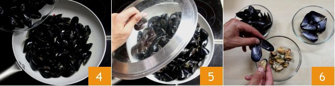Versez les moules dans la poêle 4, mélangez et couvrez avec un couvercle 5 pour ouvrir les coquilles : cela prendra environ 5 minutes. Pendant que les moules cuisent, retirez la partie jaune de la peau du citron non traité à l'aide d'un couteau et réduisez-la en fines lanières. Une fois que les moules sont ouvertes, égouttez-les et décortiquez-les 6.