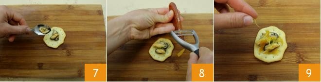 Vous pourrez ainsi composer vos fougasses, en mettant d'abord 2-3 moules sur chaque fougasse 7; continuez ensuite en râpant de la poutargue de mulet 8 ou de thon et en décorant avec quelques lanières de zeste de citron 9. Vos fougasses avec moules, poutargue et zeste de citron sont prêtes à être dégustées !
