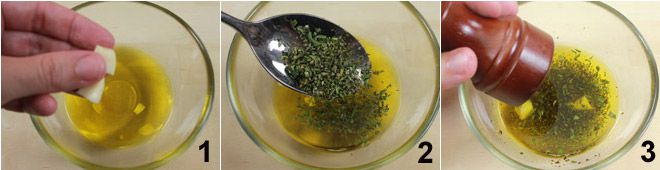 Commencez par préparer l'huile aromatique : dans une petite casserole, versez l'huile d'olive extra vierge et faites-la légèrement tiédir, retirez-la du feu et ajoutez-y une gousse d'ail coupée en deux 1, le romarin finement haché avec un couteau et les graines de fenouil que vous aurez légèrement écrasées avec la lame d'un couteau pour en libérer les arômes 2. Poivrez généreusement 3 et laissez reposer et infuser l'huile pendant au moins 2 heures.