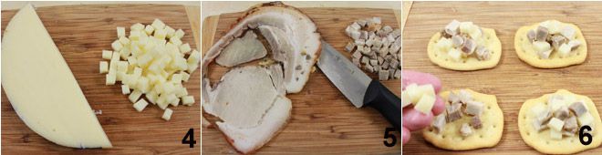 Enlevez ensuite la croûte du provolone et coupez-le en dés réguliers 4 (d'environ 1 cm de côté). Faites la même opération avec les 2 tranches de porchetta 5. Couvrez chaque fougasse avec des dés de porchetta et des dés de provolone 6. Ajoutez enfin quelques feuilles de mâche, assaisonnez de quelques gouttes d'huile aromatique et servez les amuse-bouches !