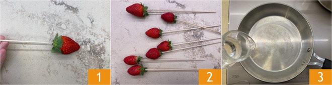 Pour préparer les fraises caramélisées, lavez les fruits puis insérez chaque morceau sur une brochette en bois 2. Dans une poêle, versez l'eau 3.