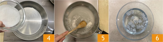 Ajoutez également le sucre 4, mélangez 5 et transférez sur le feu. Faites fondre le sucre à feu doux. Pendant ce temps, dans un bol, versez de l'eau et des glaçons 6.