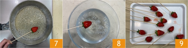 Lorsque le sirop d'eau et de sucre sera devenu épais et formera des bulles, plongez les brochettes 7 et faites-les tourner de manière à ce qu'elles soient recouvertes d'une couche uniforme et fine de glaçage. Enfin, plongez immédiatement les brochettes dans l'eau avec les glaçons pour que le glaçage se solidifie 8. Les fraises caramélisées sont prêtes à être dégustées 9.