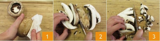 Pour réaliser la fregola aux champignons portobello, commencez par préparer le bouillon de légumes. Occupez-vous du nettoyage des champignons : coupez la base et avec un chiffon enlevez les résidus de terre 1, puis tranchez-les 2 et réduisez-les en petits morceaux 3.
