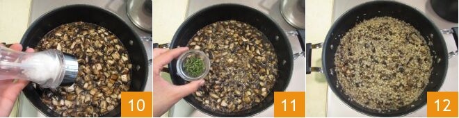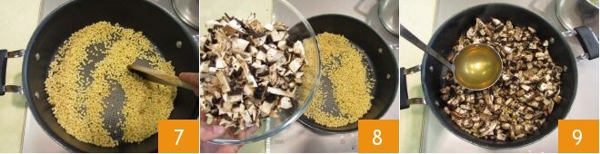 Faites griller la fregola pendant quelques instants 7, puis ajoutez les champignons portobello 8, mélangez et poursuivez la cuisson pendant environ 20-25 minutes (suivez les instructions sur l'emballage) en ajoutant le bouillon chaud 9 une louche à la fois, comme pour un risotto, en attendant que le liquide soit absorbé avant d'en ajouter d'autre.